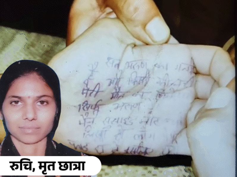 छात्रा की भाभी मोनिका ने पुलिस को बताया कि, छात्रा एक दिन अपने चचेरे भाई के साथ बाइक पर बैठकर कॉलेज जा रही थी, जब अरुण (25) और सुशील (34) ने उसका वीडियो बना लिया। अरुण गांव में ही ऑनलाइन फॉर्म भरवाने का काम करता है। सुशील नोएडा में प्राइवेट जॉब करता है। इसके बाद, अरुण ने इस वीडियो का इस्तेमाल कर छात्रा को ब्लैकमेल करना शुरू किया। उसने छात्रा पर शारीरिक संबंध बनाने का दबाव डाला और रुपयों की मांग की। रूचि ने कई बार दोनों को पैसे भी दिए। लेकिन इस बार दोनों ने 60 हजार रुपए मांगे। जब छात्रा ने इसका विरोध किया, तो अरुण ने वीडियो को गांव के लोगों के वॉट्सएप ग्रुपों पर वायरल करने की धमकी दी। इस अपमान और मानसिक दबाव को सहन न कर पाने के कारण छात्रा ने आत्महत्या का रास्ता चुन लिया। छात्रा का शव उसके घर के एक कमरे में फंदे से लटका हुआ मिला। मृतका के हाथ पर लिखे सुसाइड नोट में अरुण और सुशील को उसकी मौत का जिम्मेदार ठहराया गया है। सुसाइड नोट में छात्रा ने बताया कि वह लगातार ब्लैकमेलिंग और मानसिक उत्पीड़न का शिकार थी, जिसने उसे इस कदम तक पहुंचा दिया।