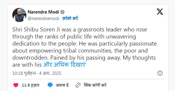 इधर, प्रधानमंत्री नरेंद्र मोदी ने भी शिबू सोरेन के निधन पर शोक व्यक्त किया है। उन्होंने एक्स पर लिखा- ‘शिबू सोरेन एक ज़मीनी नेता थे, जिन्होंने जनता के प्रति अटूट समर्पण के साथ सार्वजनिक जीवन में ऊंचाइयों को छुआ। वे आदिवासी समुदायों, गरीबों और वंचितों के सशक्तिकरण के लिए विशेष रूप से समर्पित थे। उनके निधन से दुःख हुआ। मेरी संवेदनाएं उनके परिवार और प्रशंसकों के साथ हैं। झारखंड के मुख्यमंत्री हेमंत सोरेन से बात की और संवेदना व्यक्त की. ॐ शांति।