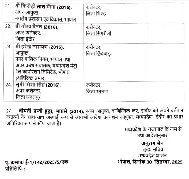मध्य प्रदेश में बड़ा प्रशासनिक फेरबदल, 24 IAS अधिकारियों के तबादले की सूची जारी