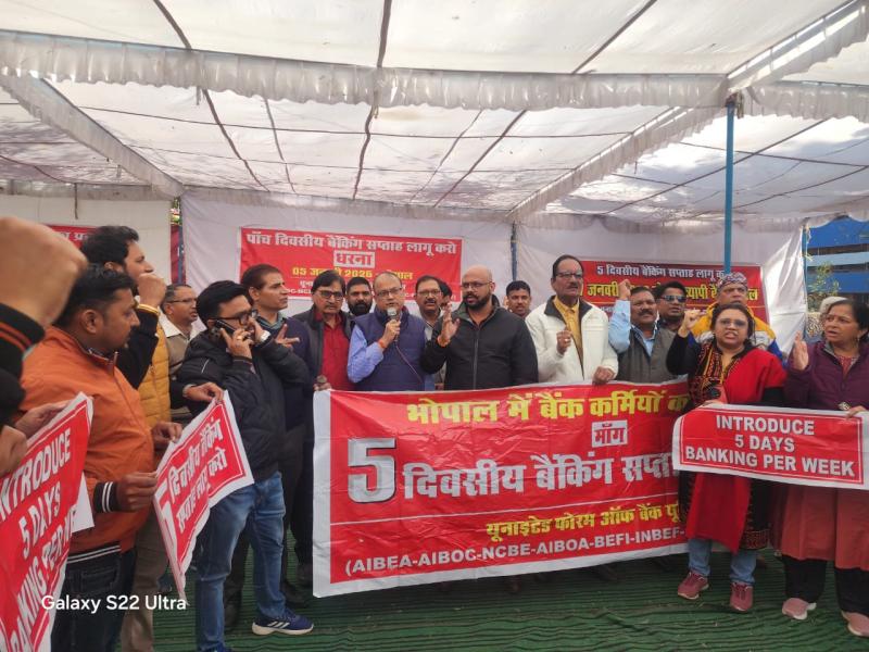 भोपाल में बैंक कर्मियों का जोरदार धरना प्रदर्शन पाँच दिवसीय बैंकिंग सप्ताह लागू करने की मांग बुलंद
